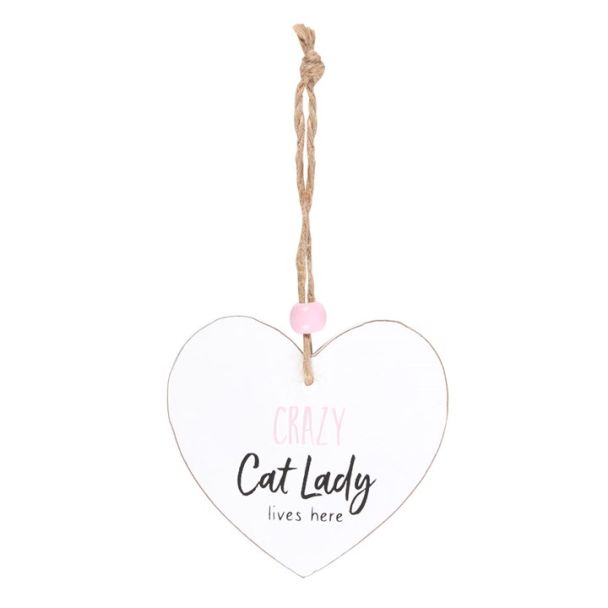 - Adorable white wooden heart decoration featuring the playful sentiment: "Crazy cat lady lives here"